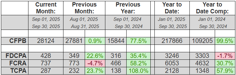 September 2025 saw TCPA and FDCPA litigation spike by double digits (+23.7& and +22.6% respectively) while FCRA litigation ticked down a bit (-4.7%).