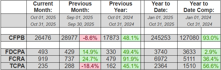 Quick analysis: TCPA & CFPB Complaints Down, FDCPA & FCRA Complaints Up for October