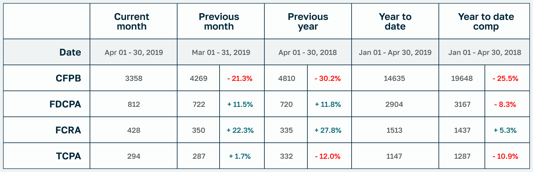 For the first time since January, all lawsuit categories were up in April (FDCPA +11.5%, FCRA +22.3%, TCPA +1.7%) though CFPB complaints were down (fairly dramatically at -21.3%) from the prior month.