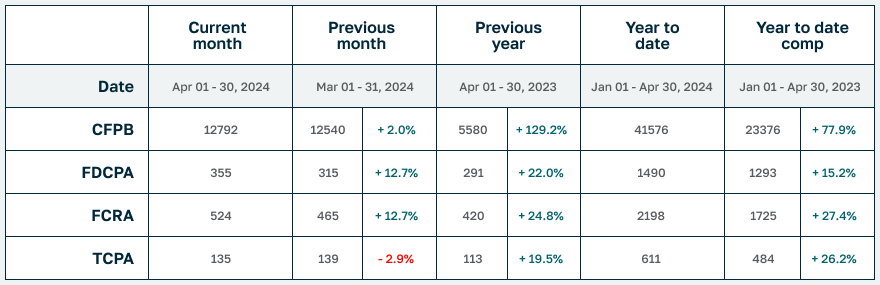 In April, FDCPA (+12.7%) and FCRA (+12.7%) suits were up over March, and TCPA (+26.2%), FDCPA (+15.2%) and FCRA (+27.4%) suits were all up YTD. CFPB complaints were also up for the month (+2%) and the year (77.9%!). The only holdup from a complete sweep was April TCPA suits, which ticked down -2.9% from March.