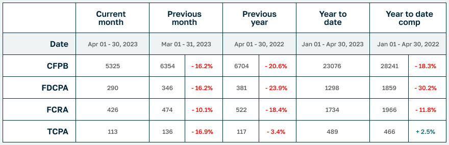 In April, everything was down again (mostly by double digits) after a short March rebound. How far down? FDCPA was down -16.2% for the month and -18.3% YTD. FCRA was down -10.1% for the month and -30.2% YTD. And TCPA was down -16.9% for the month, but was the only one still up a bit YTD – +2.5% over April 2022. CFPB complaints were also down, -16.2% for the month and -18.3% YTD.