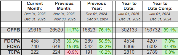 For the full year 2025, everything was up: TCPA (+.8%), FDCPA (+7.8%) and FCRA (+37.4%), while CFPB complaints against creditors and debt collectors almost doubled, increasing from over 159k in 2024 to over 302k in 2025.