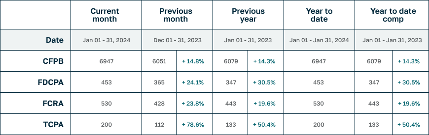 For some context, here’s a thought experiment. If every month in 2024 ends up like January, TCPA litigation would end the year 42.6% up over 2023, FDCPA would be 30.5% up and FCRA would be 13.8% higher. That’s a pattern we haven’t seen in many years, but of course these numbers are only one month in to 2024 and don’t really mean anything yet. Other than, wow, what a month.