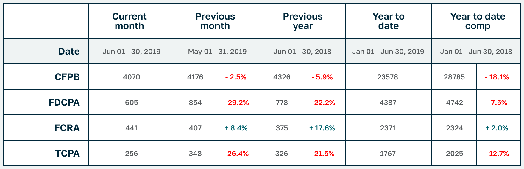 Litigation for June 2019 followed a now-familiar path, with FDCPA and TCPA dipping significantly down from the previous month (-29.2% and -26.4% respectively) while FCRA increased +8.4%. Year-to-date shows the same trends, but more moderated with FDCPA -7.5%, FCRA +2% and TCPA -12.7%.