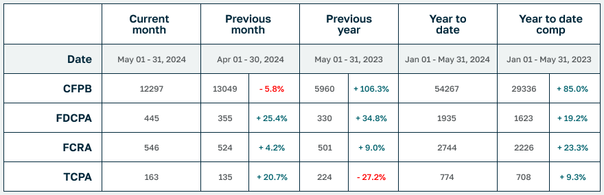 In May, TCPA (+20.7%), FDCPA (+25.4%) and FCRA (+4.2%) suits were all up over April, and TCPA (+9.3%), FDCPA (+19.2%) and FCRA (+23.3%) suits were all up YTD as well. Meanwhile, CFPB complaints were a bit down for the month (-5.8%) but still way up for the year (85%!).