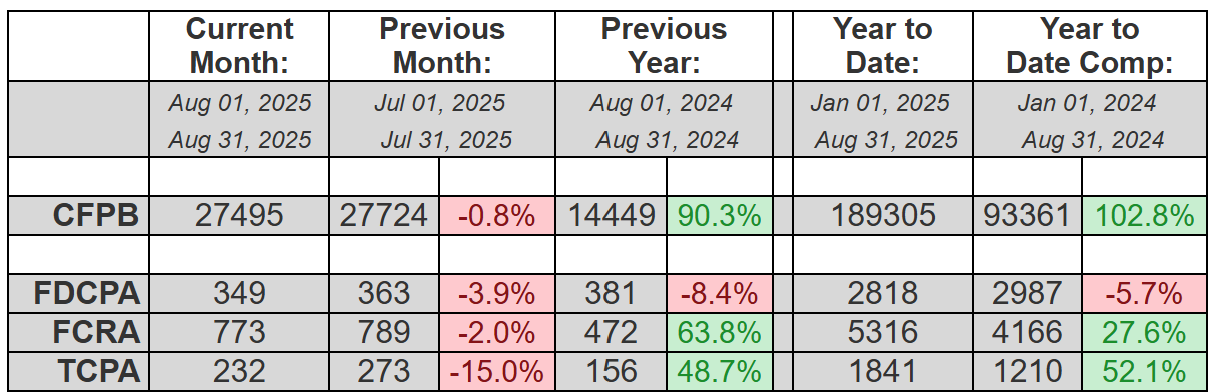 YTD, however, only FDCPA is still down (-5.7%) while TCPA is still up a lot (-52.1%) followed by FCRA (+27.6%). CFPB complaints are still up over 100% from this time last year, 102.8% to be exact.