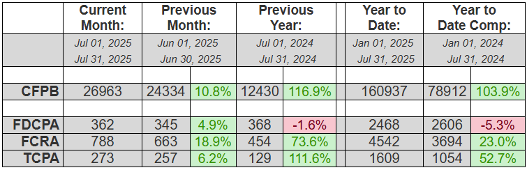 TCPA (+6.2%), FDCPA (+4.9%) and FCRA (+18.9%(!)) were all up for the month of July. YTD, TCPA (+52.7%) and FCRA (+23%) are both way up, while FDCPA (-5.3%) is the only one still lagging behind last year. But even that margin shrunk (by -.6%) last month, following a months-long pattern of getting smaller.
